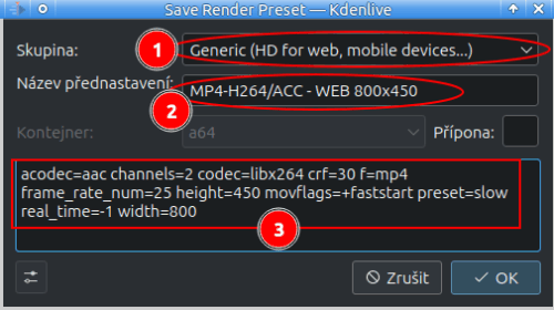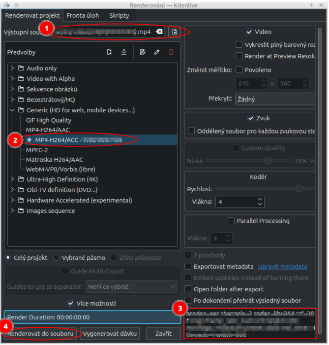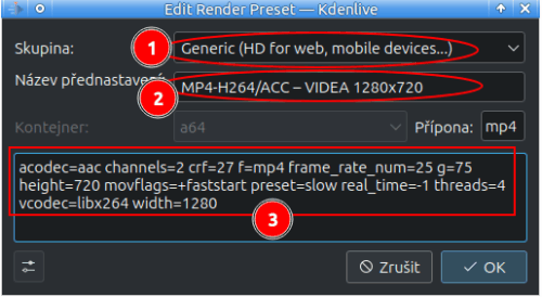 ⚠️ Ne všechny parametry jsou přenositelné z příkazu ffmpeg. Bohužel Kdenlive má vlastní interpretaci.