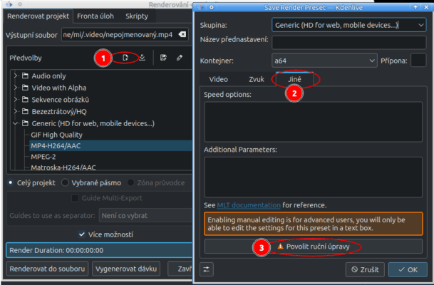 Kdenlive má jednak své profily rendrovacích parametrů, ale lze si vytvořit i vlastní.
