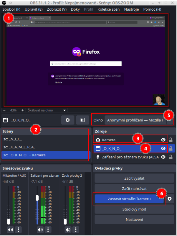 Příklad posílání obrazu z „OBS studia“ do „Zoom“
